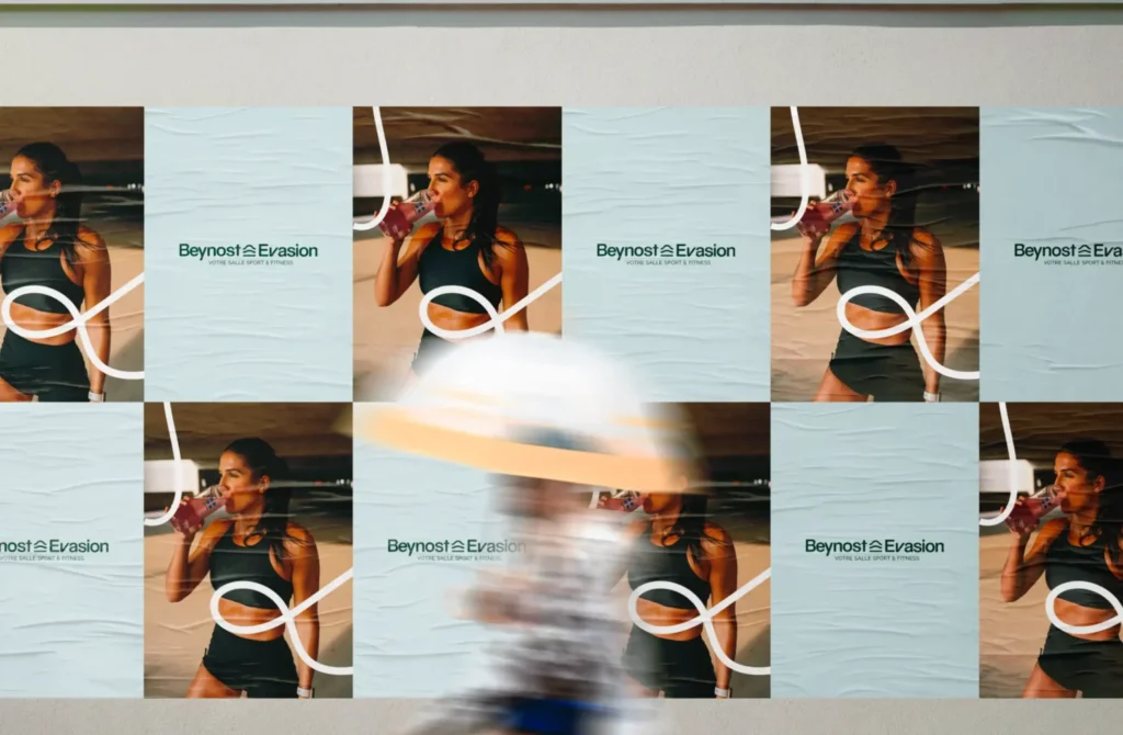 Beynost Évasion ouvre avec un système de marque complet, cohérent de la vitrophanie à l’écran de téléphone, du sweat-shirt au panneau d’entrée de ville. Le symbole s’installe  comme repère visuel reconnaissable dans le quartier, il est mémorisable et il transporte les valeurs de la salle : performance, bienveillance, évasion. La création de l’identité visuelle complète d’une salle de sport inclusive impose des contraintes spécifiques : l’identité doit parler à une mère de famille qui cherche un cours de gym douce le mardi matin autant qu’à un jeune actif qui veut soulever de la fonte le samedi.
